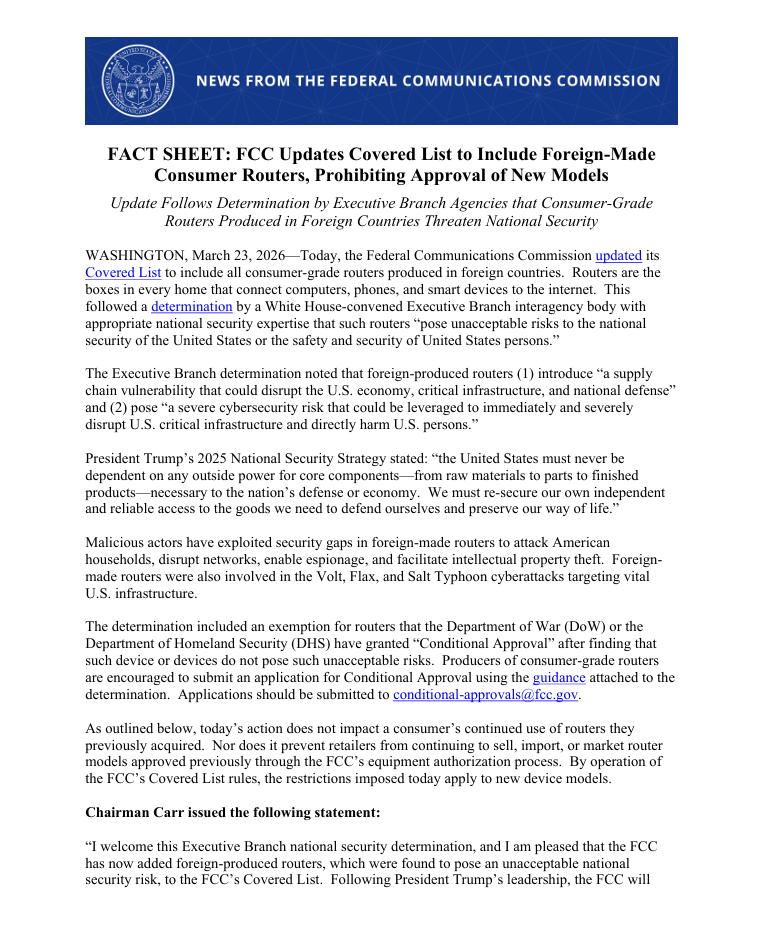 据媒体报道,美国联邦通信委员会(FCC)于当地时间 3 月 23 日更新受管制清单,宣布禁止进口所有外国制造的消费级路由器,理由是此类设备被认定对美国国家安全及人员安全构成 “不可接受的风险”,相关新规已正式公布。